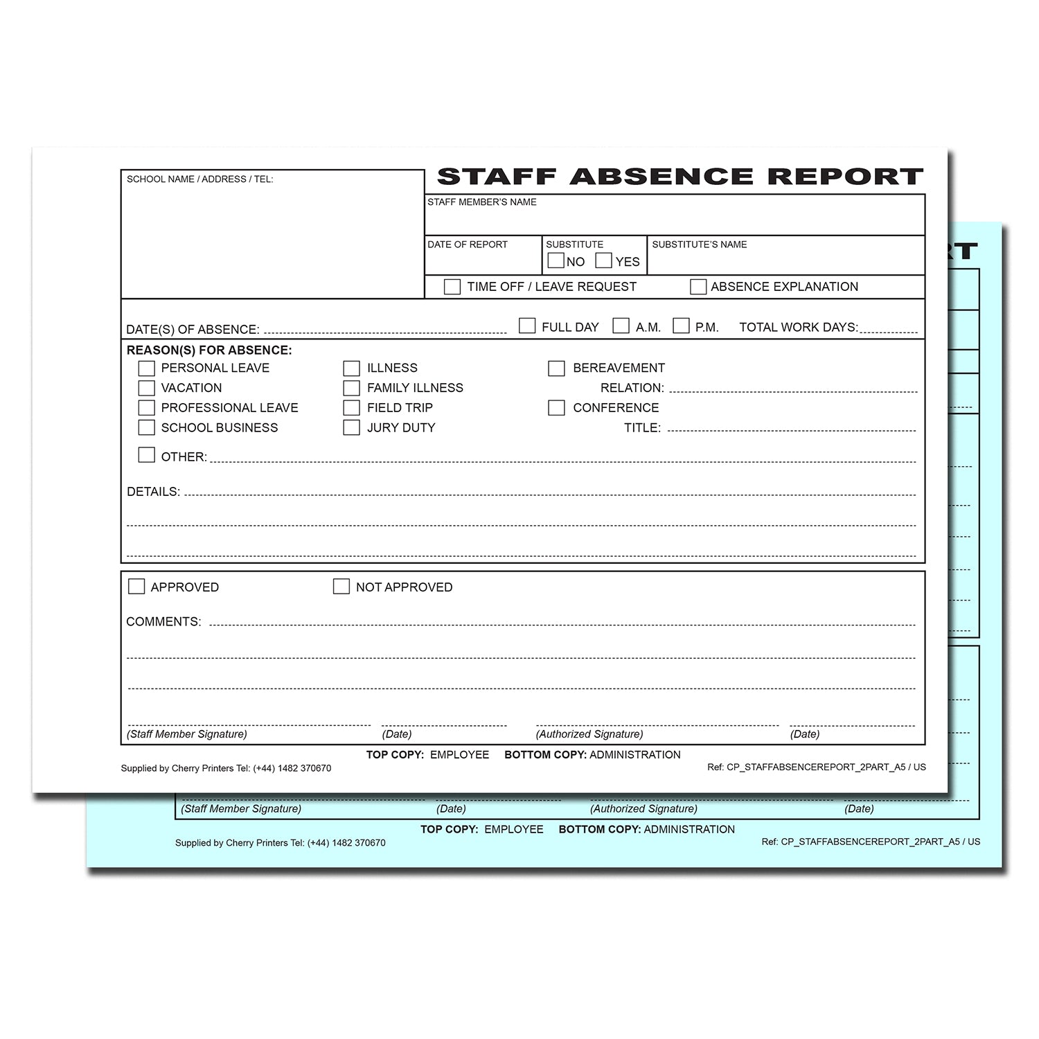 Staff Absence Report | Duplicate Book | 2 part | Carbonless | 50 Sets Per Book | A5 - 5.8" x 8.3" | BOX OF 40 BOOKS