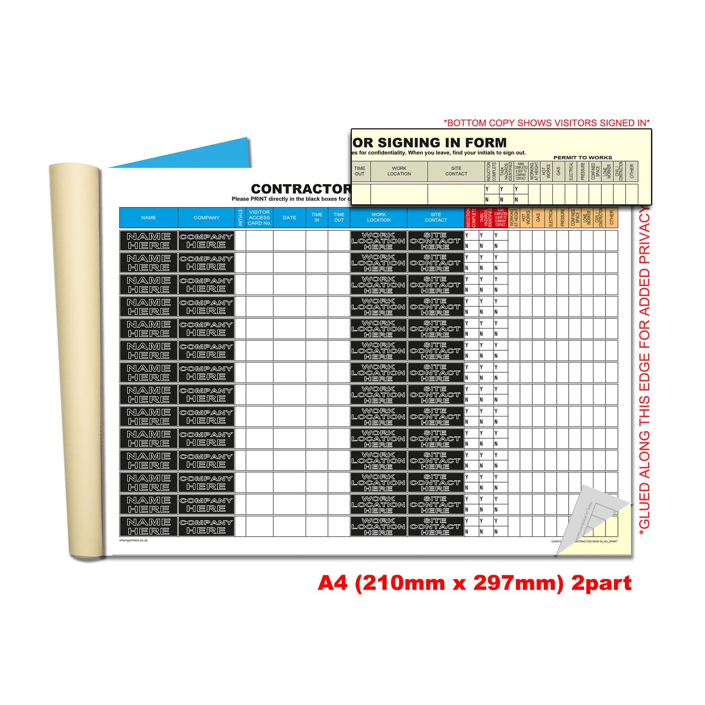 - Confidential contractor sign-in – carbonless duplicate book designed to log contractor and visitor details while ensuring privacy and GDPR compliance