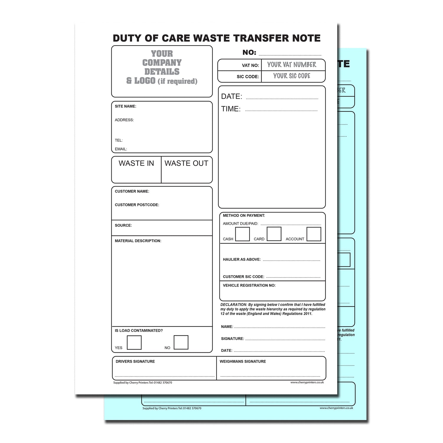 Our No Carbon Required (NCR) Waste Transfer Note (WTN) or a Duty of Care Waste Transfer Note is a document that must be completed when waste is transferred from one party to another, keeping you legal. If a waste transfer note is not completed during the transfer of waste you are almost certainly breaking the law and could face a fine.