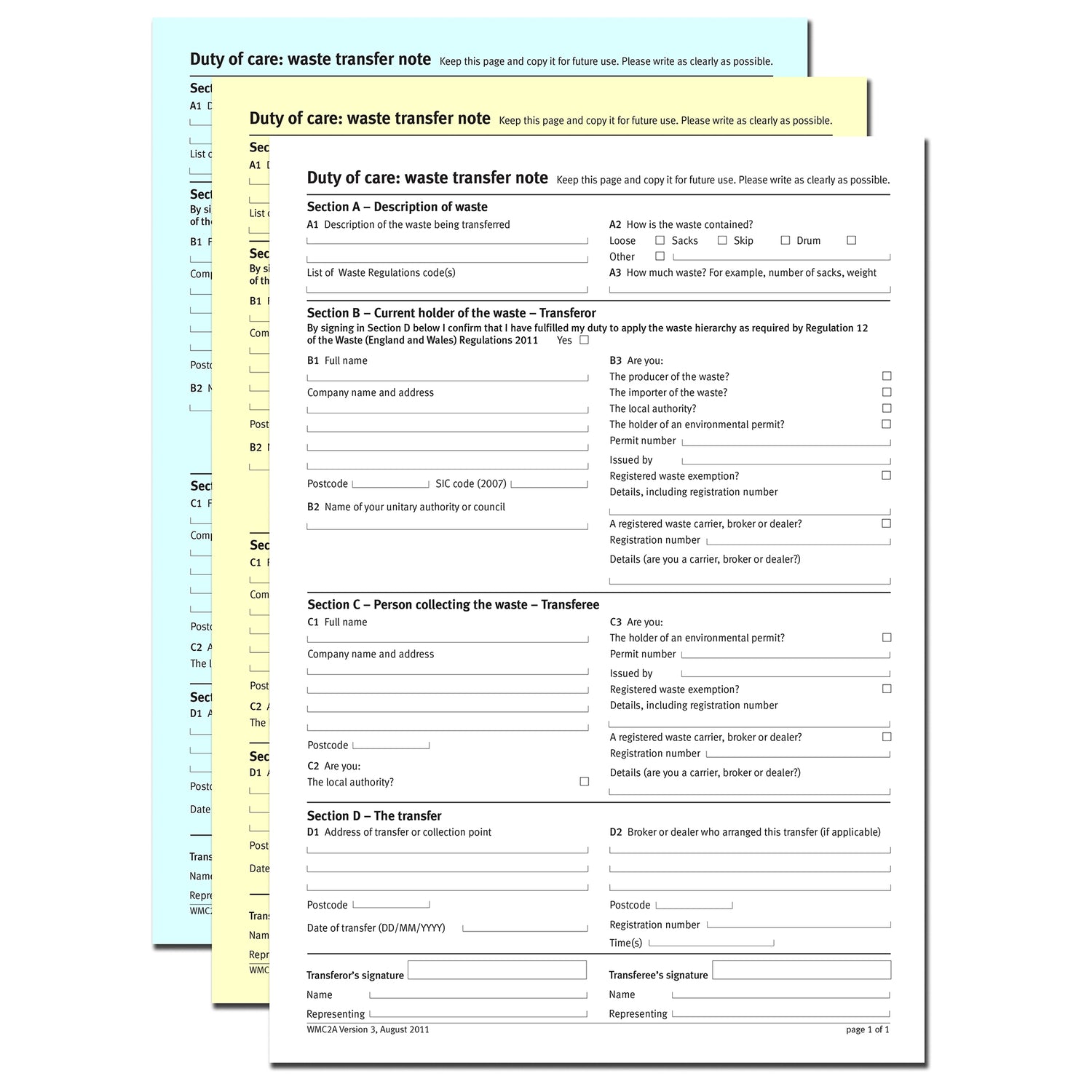 Our No Carbon Required (NCR) Duty of Care Waste Transfer Note is a document that must be completed when waste is transferred from one party to another, keeping you legal. If a waste transfer note is not completed during the transfer of waste you are almost certainly breaking the law and could face a fine.