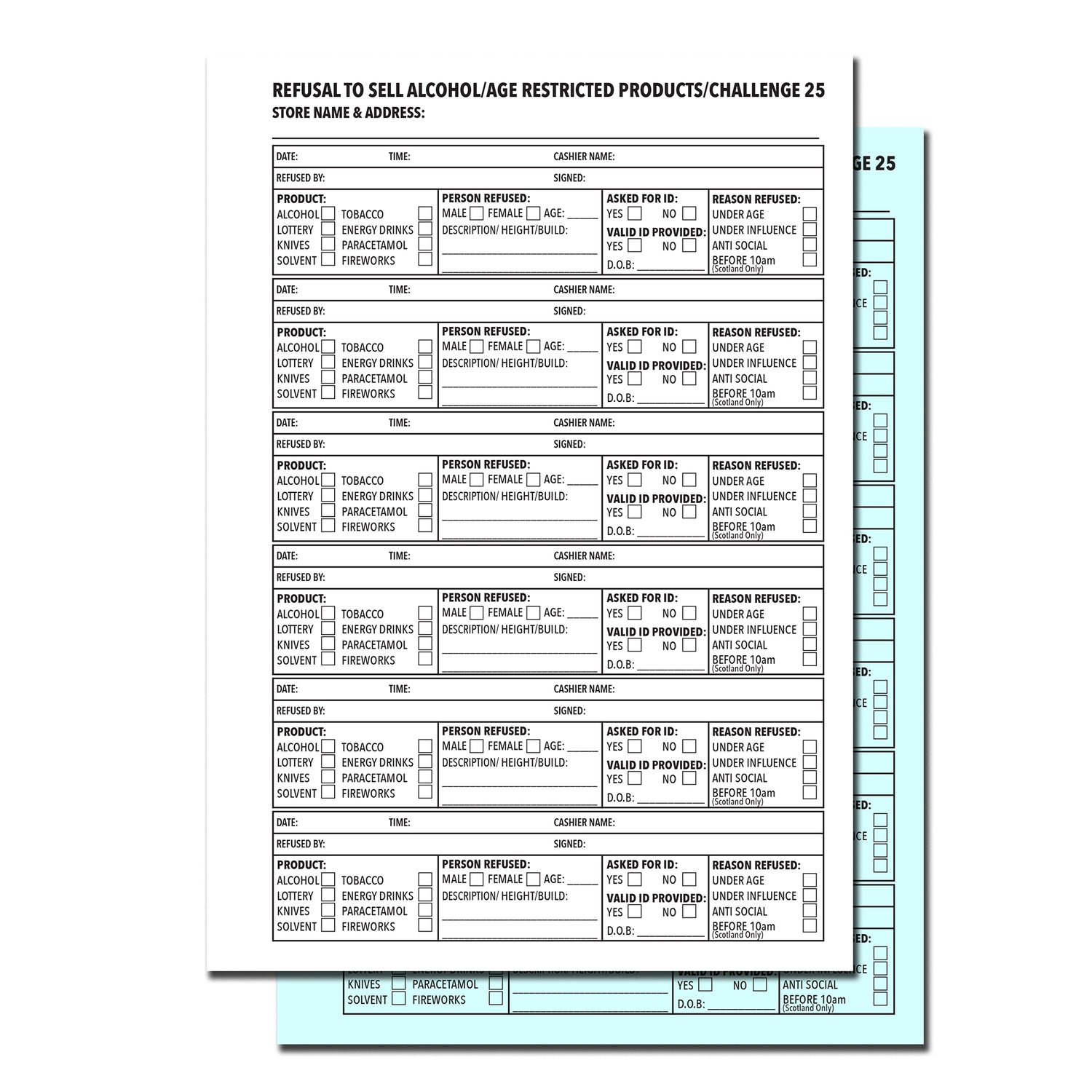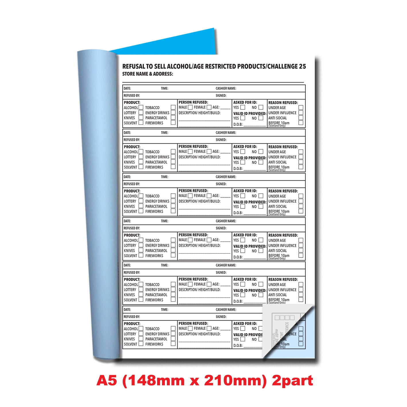 Our No Carbon Required (NCR) Refusal to Sell Alcohol/Restricted Goods Book is sized A5 which is 148mm x 210mm. A handy book for any store requiring to keep a log of age restricted items refused sale for various reasons. with 6 logs per page totalling 300 logs per book.