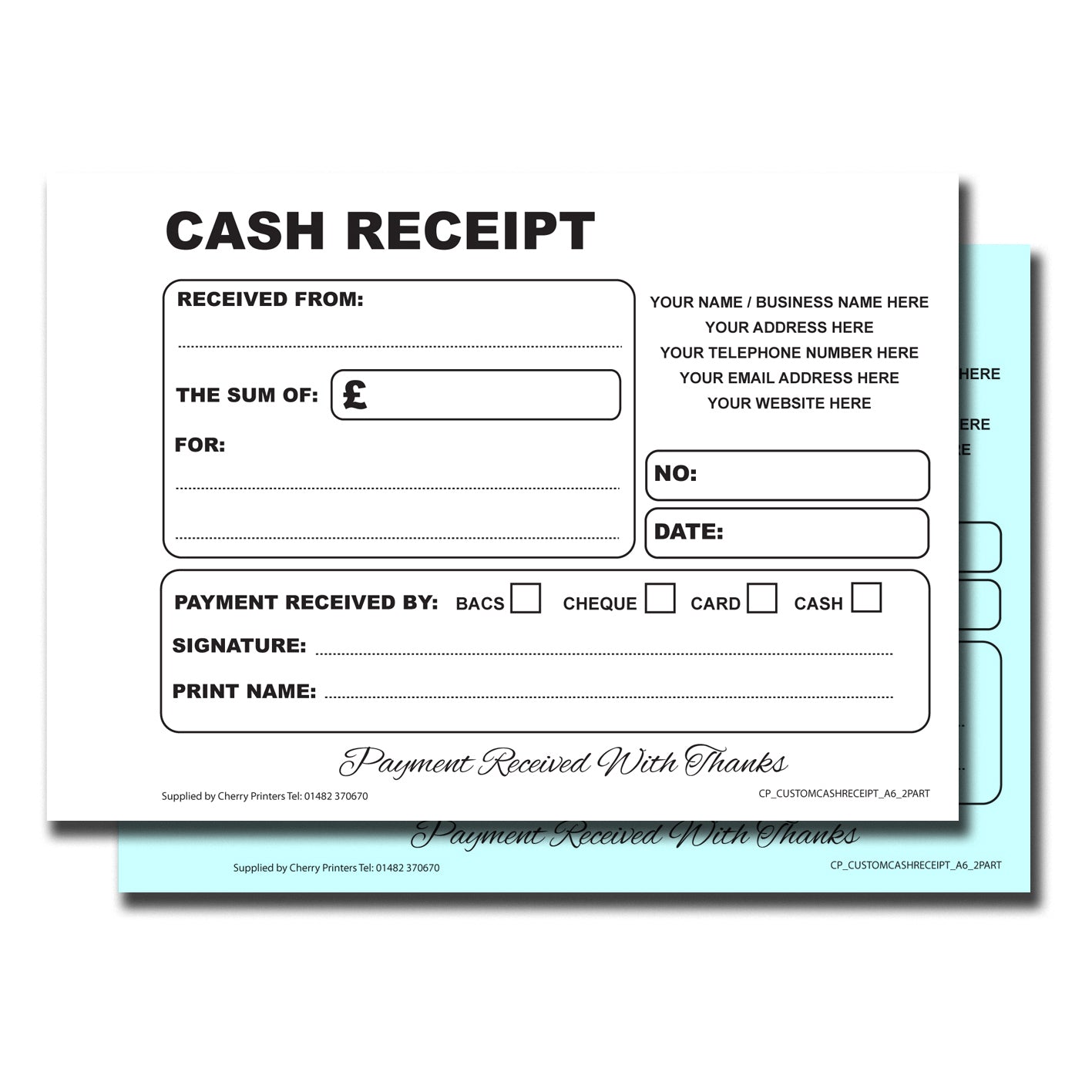 Cherry Printers No Carbon Required (NCR) Custom Duplicate Cash Receipt Books are ideal for all your accounts & record keeping requirements. With your company details added for the personal touch. At a handy size of A6 which is 148mm x 105mm so would easily fit in a pocket. Easy to use as the top copy is perforated for easy removal whilst the bottom copy remains in the book. It is stitched and bound with tape on the left hand edge (short edge) for a traditional finish. With space to write receipt number, date, received from, the sum of and a handy section stating which method the payment was received ie, BACS, cheque etc. All books come as 50 sets with a loose leaf writing shield.