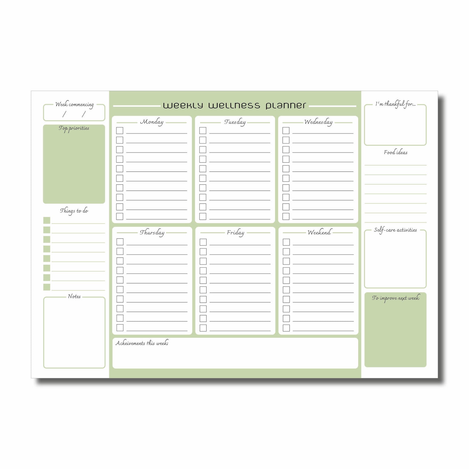 - 52 undated sheets – plan your wellness journey week by week for a full year